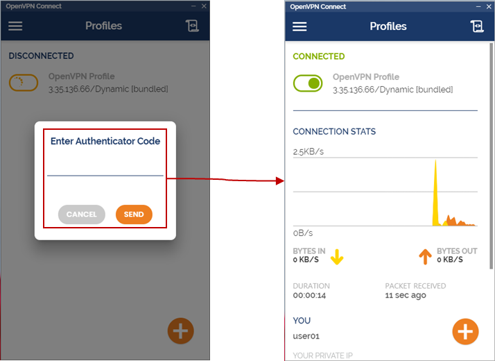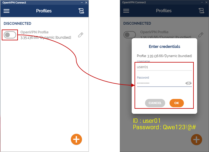 Profile 생성 > ID / PW 입력 (user01 / Qwe123!@#) > 2FA(구글 OTP) 인증 > VPN 연결 : 아래 이미지 참조