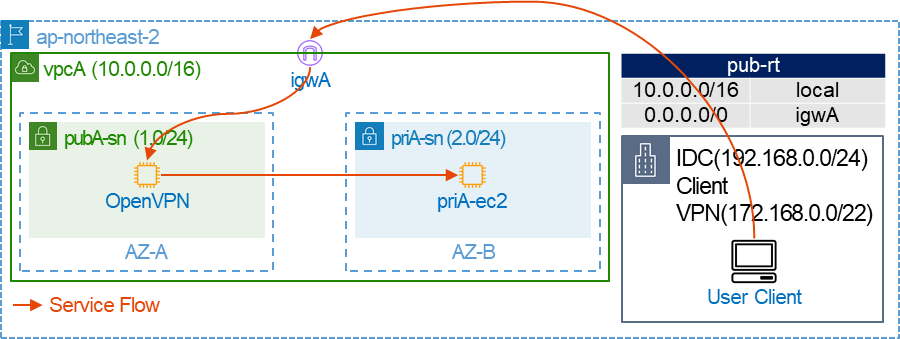| Client VPN으로 접속 하면 User Cleint가 OpenVPN 인스턴스와 연결되고, 이후 priA-ec2를 사설 IP로 접근이 가능합니다. ① User Client에서 OpenVPN으로 Client VPN 연결에 대한 Profile(ID/PW + 구글OTP)을 등록하여 VPN 연결합니다. - VPN 터널링이 되면 Local(User Client)는 172.168.0.0/20 대역 중 하나의 IP를 부여 받음 - Local에 부여된 터널용 IP(172.27.224.0/20)는 터널 구간(IDC~AWS)구간에서만 사용 ② VPN이 연결되면 OpenVPN(Proxy 역할) 경유하여 IDC에서 AWS로 Private 통신이 가능합니다. |