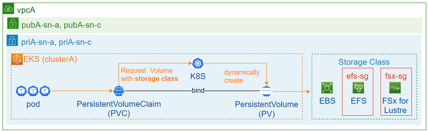 | 볼륨 연결 순서는 아래와 같습니다. 1. Storage Class를 배포합니다. 2. PVC를 배포합니다. 3. Pod 배포되면서 PVC 호출합니다. 4. PVC는 Storage Class를 확인하고, PVC와 바인딩된 Storage Class(=PV)를 Pod 볼륨으로 연결됩니다. (즉, PV가 자동으로 생성됨) Storage Class - EBS : Worker Node에 연결된 EBS를 의미하는 것이 아니라, 별도 생성되는 볼륨을 의미하며, AZ 종속적입니다 - EFS는 2개의 서브넷 지정이 가능하나, FSx for Lustre는 1개의 서브넷 지정만 가능합니다. |