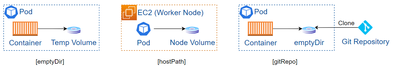 gitRepo : 물리적으로는 emptyDir 생성, 지정된 Git Repository 내용을 clone으로 다운