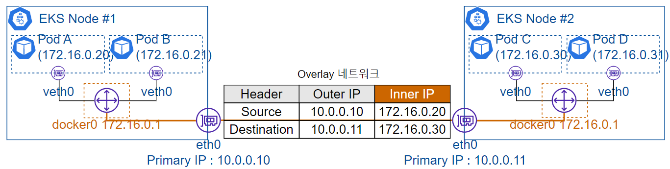 EKS는 Overlay가 아닌 일반 VPC 네트워킹하므로 EKS Cluster가 동작하는 Subnet은 여유있게(22 bit 이상) 할당 권고