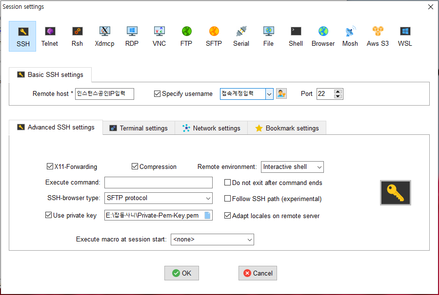 | 구분 | Remode host | Specify username | Port | User private key |