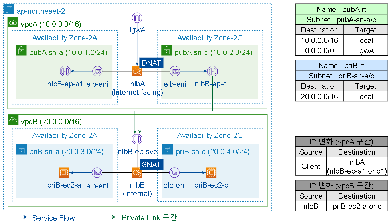 | vpcA의 nlbA로 서비스 요청이 오면 nlbB의 Endpoint를 거쳐 ec2로 전달되는 구성입니다. 보시는 것처럼 여러번의 NAT가 발생하여 소스IP 추적은 어려울 것으로 판단됩니다. 소스 IP를 확인하고자 한다면 nlbA에서 발생하는 로그를 S3에 저장하여 확인하시면 됩니다.(https://sh-t.tistory.com/50 참조) |